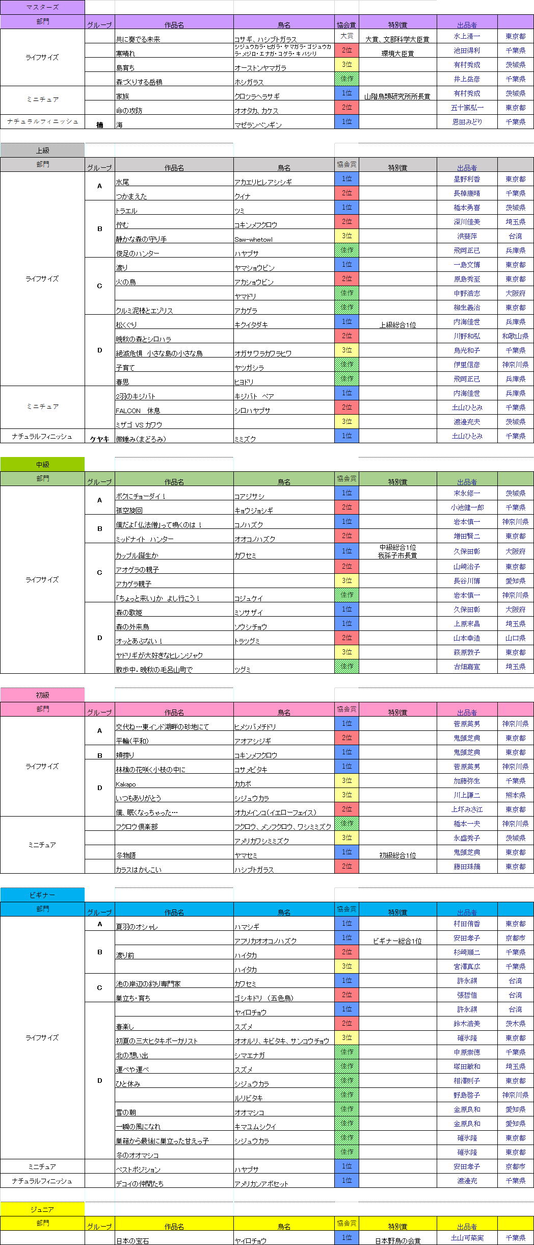 第25回 全日本バードカービングコンクール受賞者一覧(敬称略)